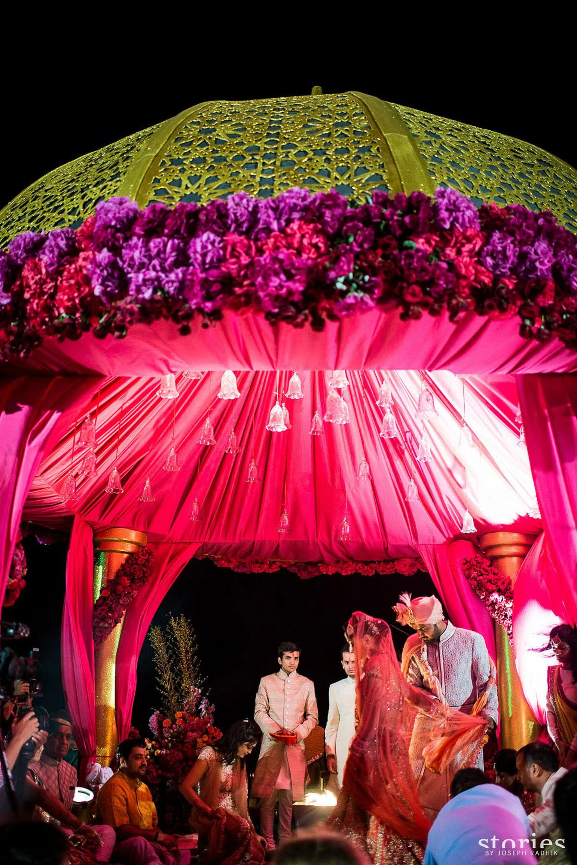 婚礼在巴厘岛东部的Nusa Dua的Hotel Sofitel Bali Nusa Dua Beach Resort举行,主人家一连三天包下酒店宴请亲友,全天候举行庆祝派对,宾客每天都会收到精致礼物。共有40多位来自外地和当地厨师为多场欢宴会联手泡制印度不同省份的特色素食,另外还有知名黎巴嫩和泰国餐厅特别提供的佳肴,足见经营餐饮生意的Jhunjhnuwala家族对美食的执着。