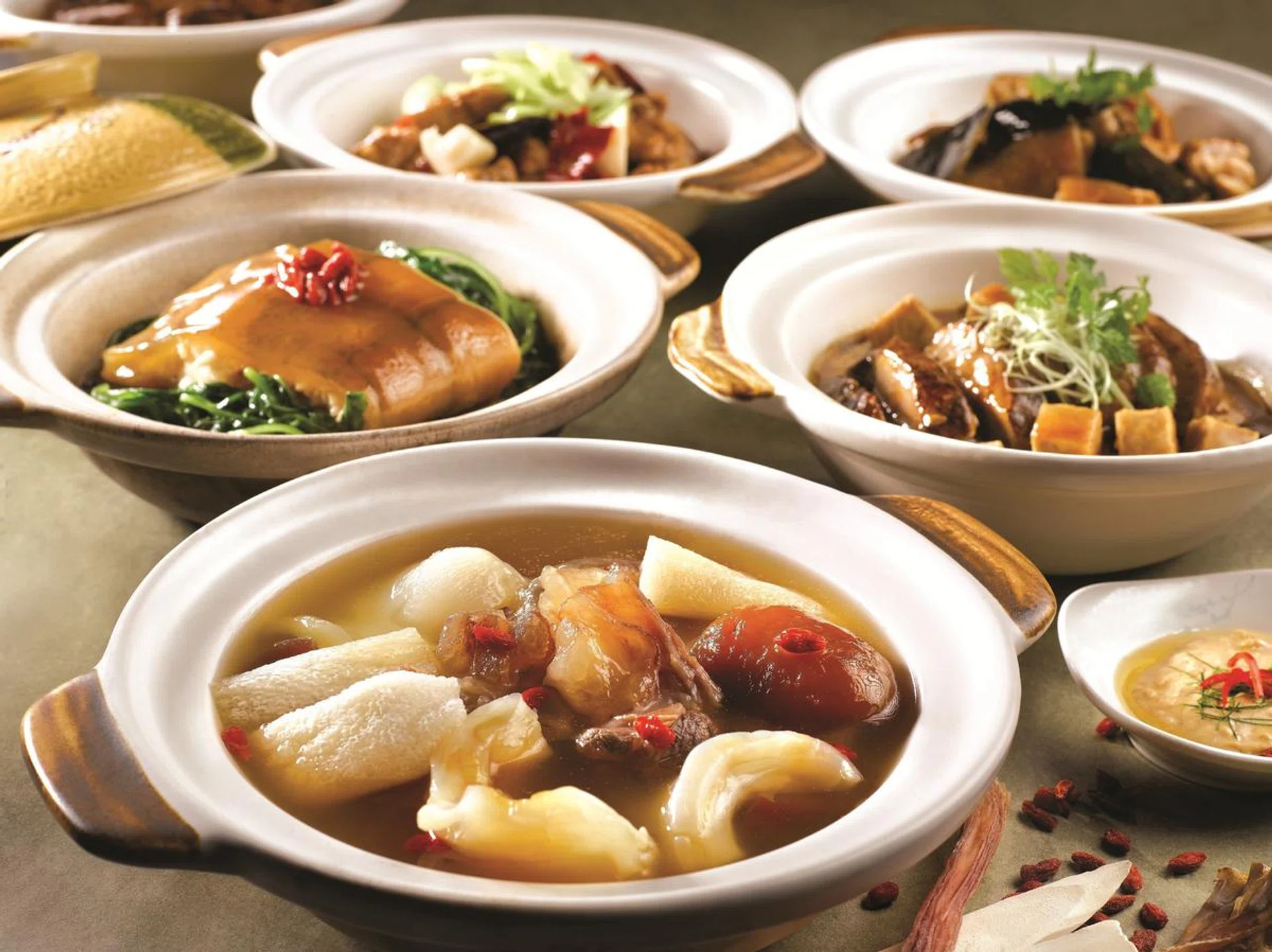 多道养生滋补的冬季菜肴包括:冬虫草心羊肚菌响螺炖樱花鸡、冬菇栗子木耳焖鸡烧鸭煲、马卡药膳煮田鸡煲、梅子香芋焖鸭煲、双冬屈黑草羊煲、红烧山瑞煲、港式腊味煲饭等等,烹调手法多元。