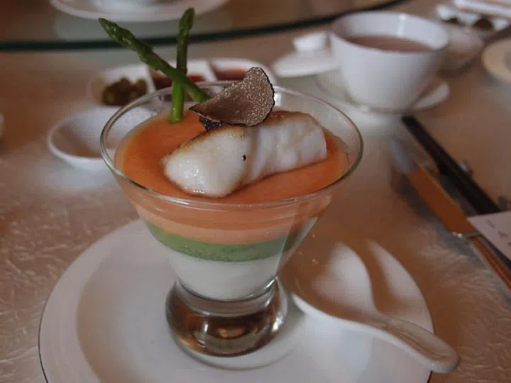 赖师傅带来的菜式当中包括两道得奖佳作:“雪岭红梅映松露”与“白翠红玉藏珍地”,分别获得香港旅游发展局2010年及2015年美食之最大赏至高荣誉金奖。“雪岭红梅映松露”装在玻璃杯里呈上,造型有如甜品一样,三色彩层由胡萝卜、芥兰与蛋白组成,上面是鱼片与松露,飘来松露的香味。