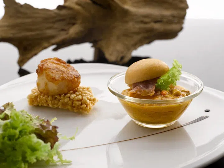 味之楼Parma Ham Mantou Slider served with Hairy Crab Roe accompanied with Pan seared Scallops with Teriyaki Sauce。