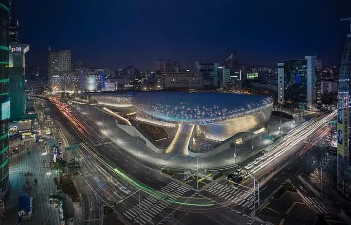 东大门设计广场位于韩国首尔东大门,是一座三维式非标准建筑,以与周边地形融合作为设计理念。总面积为86574平方米,历经五年于2014年正式开放,是首尔的地标建筑之一。东大门设计广场采用一种将二维平面图面信息转换成三维立体设计的最尖端设计技法“建筑信息模型”。整个建筑是毫无接缝的流水线形,外观呈曲线形像个巨大的外星宇宙飞船,内部没有一根柱子。