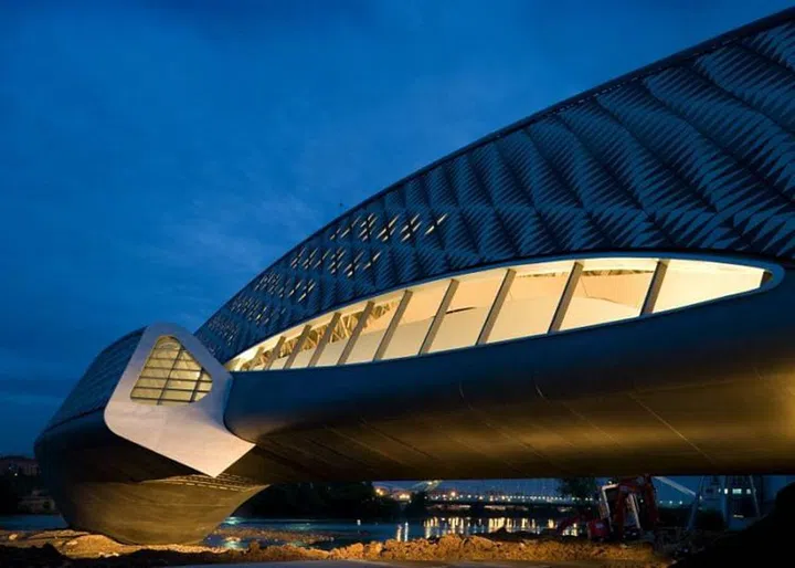 萨拉戈萨桥(Zaragoza Bridge Pavilion) 位于西班牙萨拉戈萨,亦称蓬桥馆与桥亭,横跨埃布罗河,长为270米,是2008年世界博览会的三大主题馆之一,也是Zaha Hadid最具代表性建筑之一。此桥是西班牙唯一具有室内空间需求的桥梁。