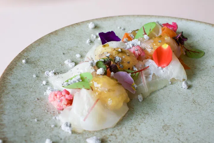 已经快到了一年的樱花时节,Lewin Terrace推出全新的春季午餐菜单,从日本进口优质食材,让在远洋之外的新加坡也感受到春天的气息。主厨Hiroyuki Shinkai设计了全新的菜肴,让食客感受味道与口感之间的碰撞出的火花。菜单中主打的Seabream Carpaccio用纸一般薄的萝卜作为基底,在Amazu中腌制,这是一种甜酸的腌料,让这道菜有着爽脆的口感与烟熏的味道。切碎的海鲈鱼生鱼片和大石浸泡的果冻片以及腌制的粉色花椰菜片和樱花果皮均被巧妙地置于顶部。 作为与这道菜的轻质口味以及使用五颜六色的花瓣作为装饰物的对比,黑芝麻粉撒上奶油质地,以防止菜肴本来令人耳目一新。