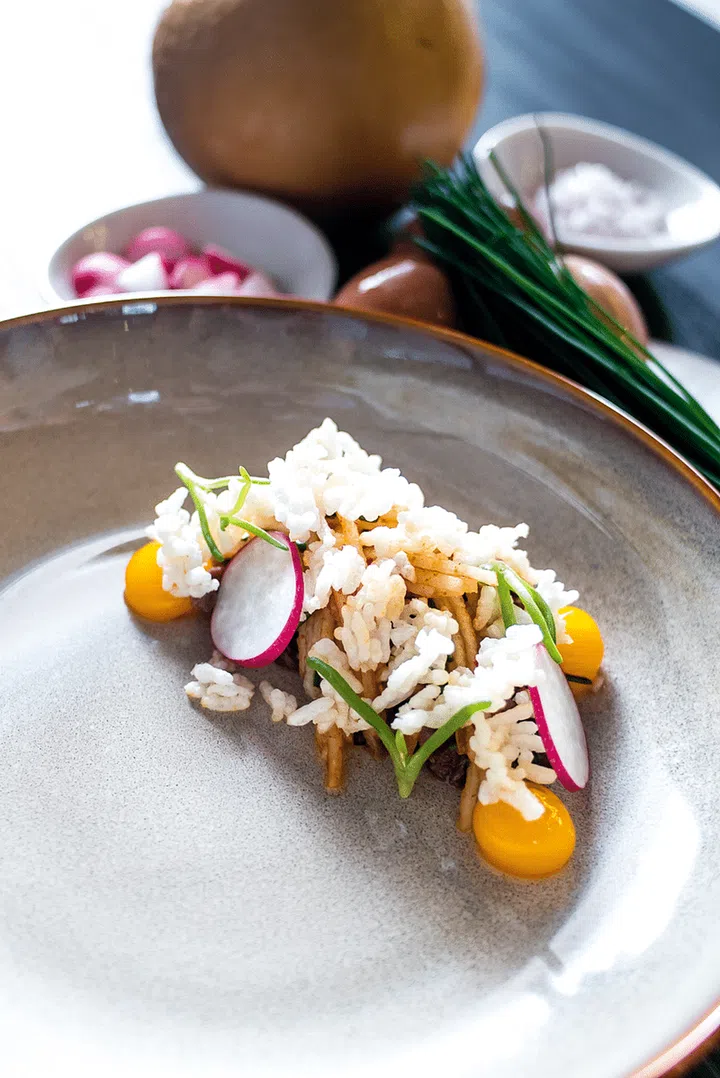Rishi的大胆创作搭配Manuela准备的有机种植和生物动力酿造的葡萄酒,餐厅开业以来已经获得不少顾客的赞誉。崇尚自然、环保的理念在料理的每个细节上都得以体现。招牌菜中,采用新鲜养殖的尖吻鲈、韭菜、鲣鱼黄油和焦糖洋葱,韭菜在大豆和雪莉酒中焖到软,但是还同时保留嚼劲,烤焦的洋葱不仅有焦糖的甜味,还有雪莉酒的味道。尖吻鲈的鱼肉颇为厚实,鲣鱼黄油的乳脂与鱼肉一起入口,不禁令人难忘。