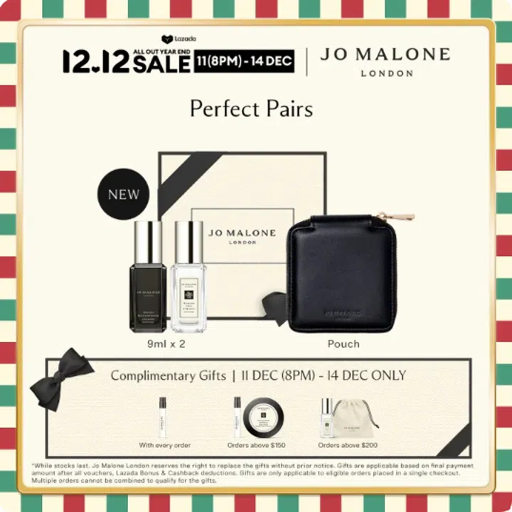 Jo Malone London12.12限定套装于Lazada年终大促期间限时登场,9ml×2迷你香氛组合搭配精致随行收纳包,新品组合一次入手,送礼或自用都不错。活动期间下单更可享满额赠礼:单笔订单即送品牌小礼,满$150加赠经典香氛小样,满$200再升级赠送抽绳香氛袋,数量有限,送完即止。