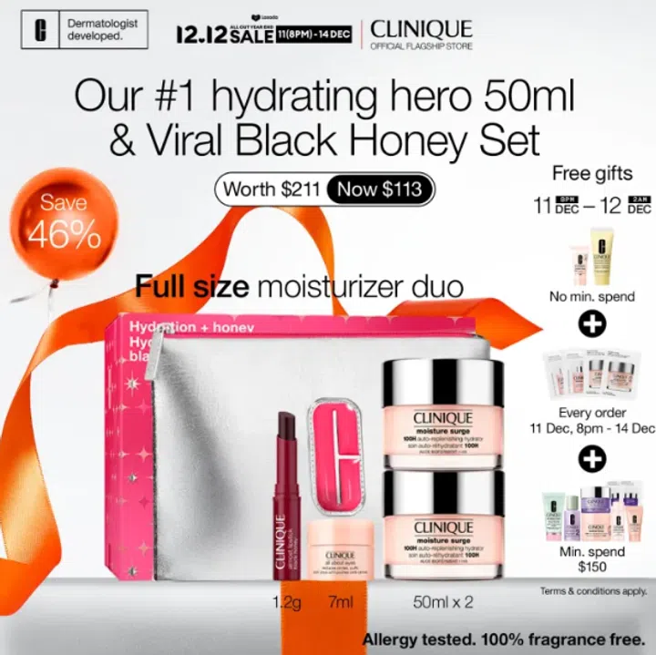 Clinique人气No.1补水组合Hydrating Hero 50ml & Viral Black Honey节日限定套装(原价 $211),内含Moisture Surge 100H自动补水凝霜50ml及爆红Black Honey唇膏,补水与好气色一次到位。12.12期间限时劲减至仅$113,以几乎半价入手热卖单品,超值优惠不容错过。