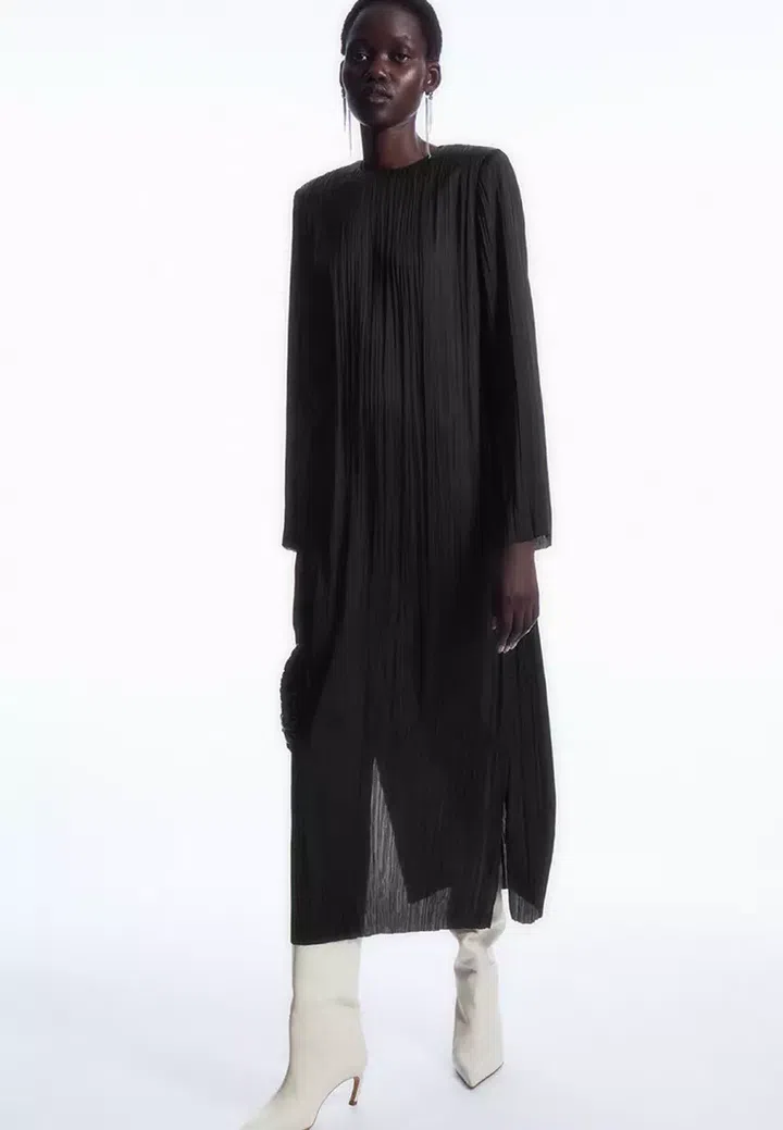 这款COS长袖百褶中长裙以极简优雅的廓形呈现,细密立体的plissé褶纹贯穿全身,拉长视觉比例,勾勒出修长身形。圆领设计干净利落,搭配微宽松的直筒剪裁与自然垂坠的裙摆,行走间富有流动感。