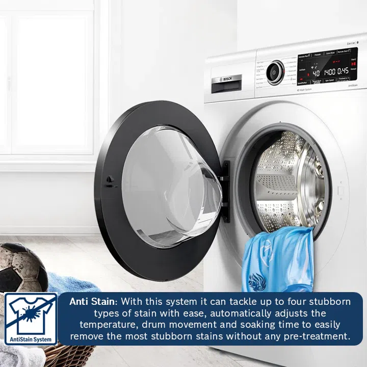 这款Bosch前开式洗衣机配备EcoSilence Drive™静音无碳刷电机,采用低摩擦设计,有效降低热量与磨损,确保运作安静、持久耐用,并带来稳定出色的洁净表现;最高脱水转速达1400rpm,可高效甩干衣物,显著缩短晾晒时间。搭载ActiveWater Plus智能节水系统与VarioDrum变速滚筒,在强劲洗净力与温和护衣之间取得理想平衡;配合AntiStain智能去渍系统,能够精准应对多种常见顽固污渍,实现自动化高效去渍。10公斤加大容量设计,一次即可满足更多家庭洗衣需求。
