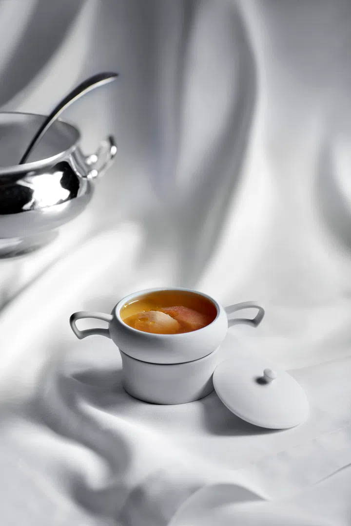 此外,餐馆的特别之处,在于它既不是单纯的复刻历史,也不是一味追求创新,而是在两者之间找到平衡。它尊重传统,却不被传统束缚;它面向未来,却始终扎根于过去。在设计菜单的过程中,江振诚参考莱佛士酒店的历史档案以及早期餐馆菜单,再以自己的独特视角重新演绎这些经典菜肴。以一道“鳖汤”为例,这道百年前受到欧洲贵族喜爱的菜肴,在江主厨的演绎下以海参、深海石斑鱼和鸡翅为主角,完全没使用鳖,却同样有丰富味道和胶质。