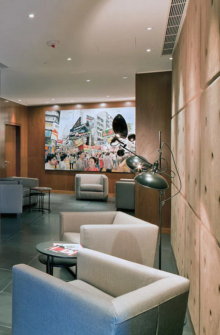 设置在酒店大堂的《City Confusion & City Orientation》钢椅雕塑,是刘小康的装置艺术作品,四张各具特色的钢椅代表香港各阶层民众,在狮子山下奋力打造安居的乐园。同样设在大堂的数码媒体作品《道生一万物生》,是洪强以新媒体诠释道家精神的装置作品。