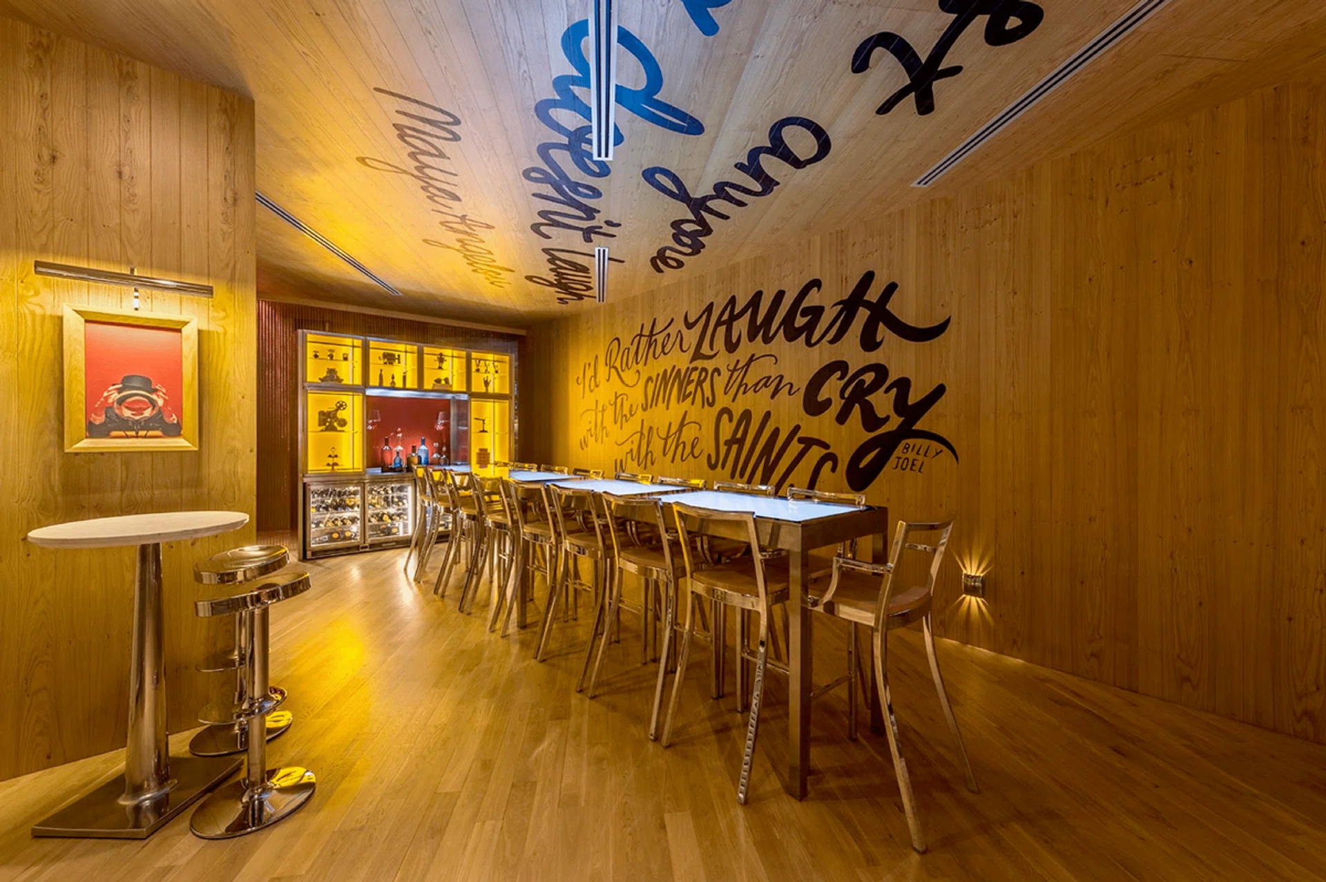 走进酒店大门,除了看到郭令明(城市发展集团主席)夫人收藏的波特罗雕塑等艺术品之外,映入眼帘的是一面巨大的LED墙,放映由韩国当艺术家李二男 (Lee Lee Nam)作品组合而成的视频,抢眼的色彩和闪动的画面,感觉很“潮”。接待柜台的设计同样别出心裁,七张封在四方透明玻璃箱里的精致桌子,个别体现欧洲、 土生华人和摩尔文化等古典设计风格。一张七米长的大理石桌子是大堂的亮点,吊灯在桌面洒下摩登文字图像投影,搭配多张Philippe Starck的经典Ghost透明塑料椅,再次宣示了设计师的“主权”。
