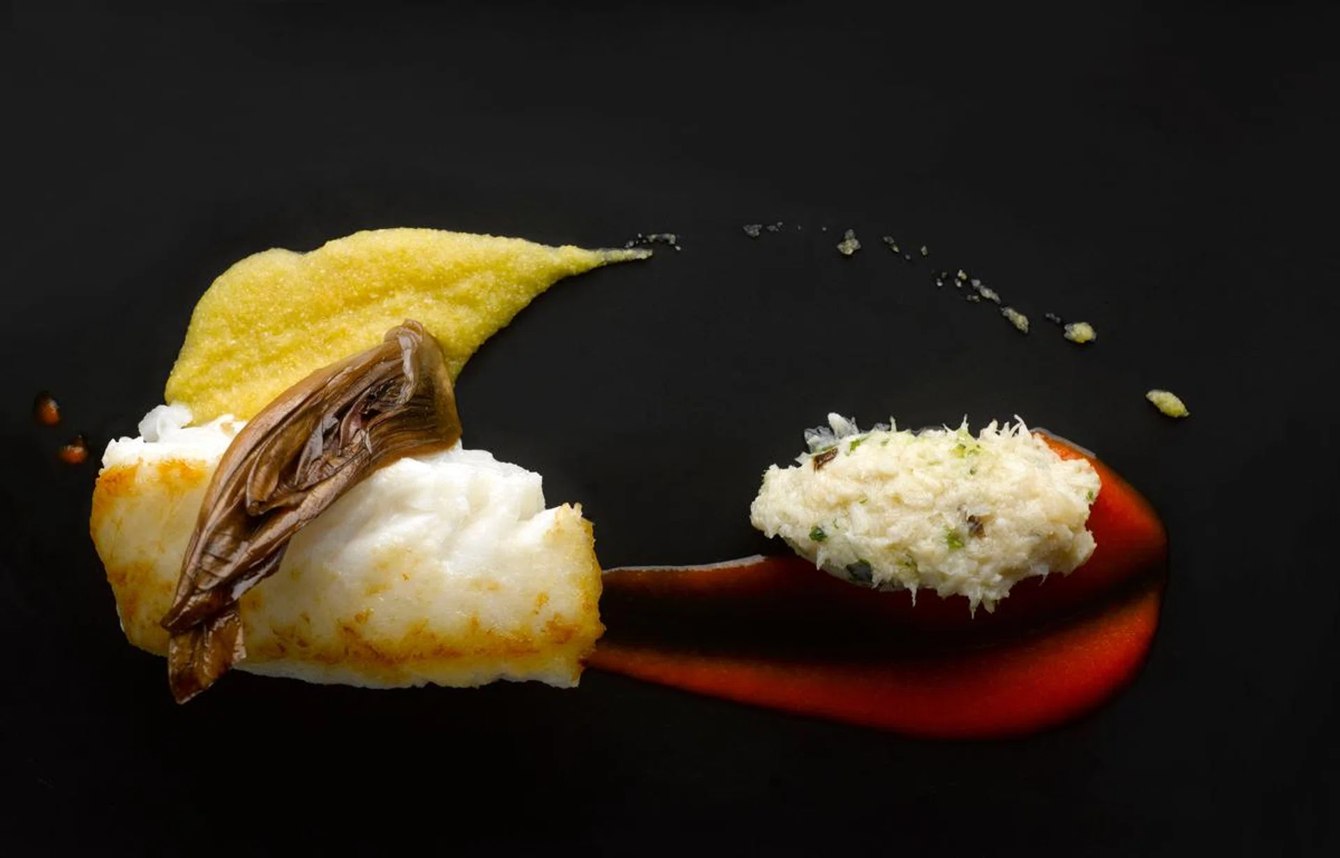 Baccala in Due Maniere是一种鱼两种烹饪法的艺术呈现,慢烤鳕鱼混合了焖洋葱和浓缩奶,香煎鳕鱼则配上有机玉米糊(polenta)与意大利碳烧紫菊苣。