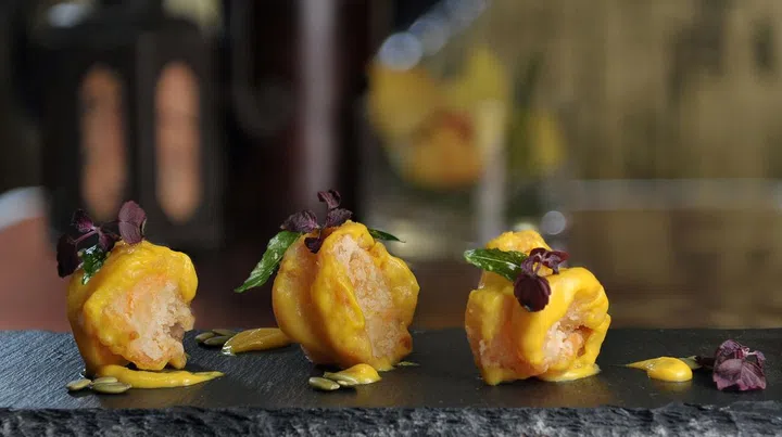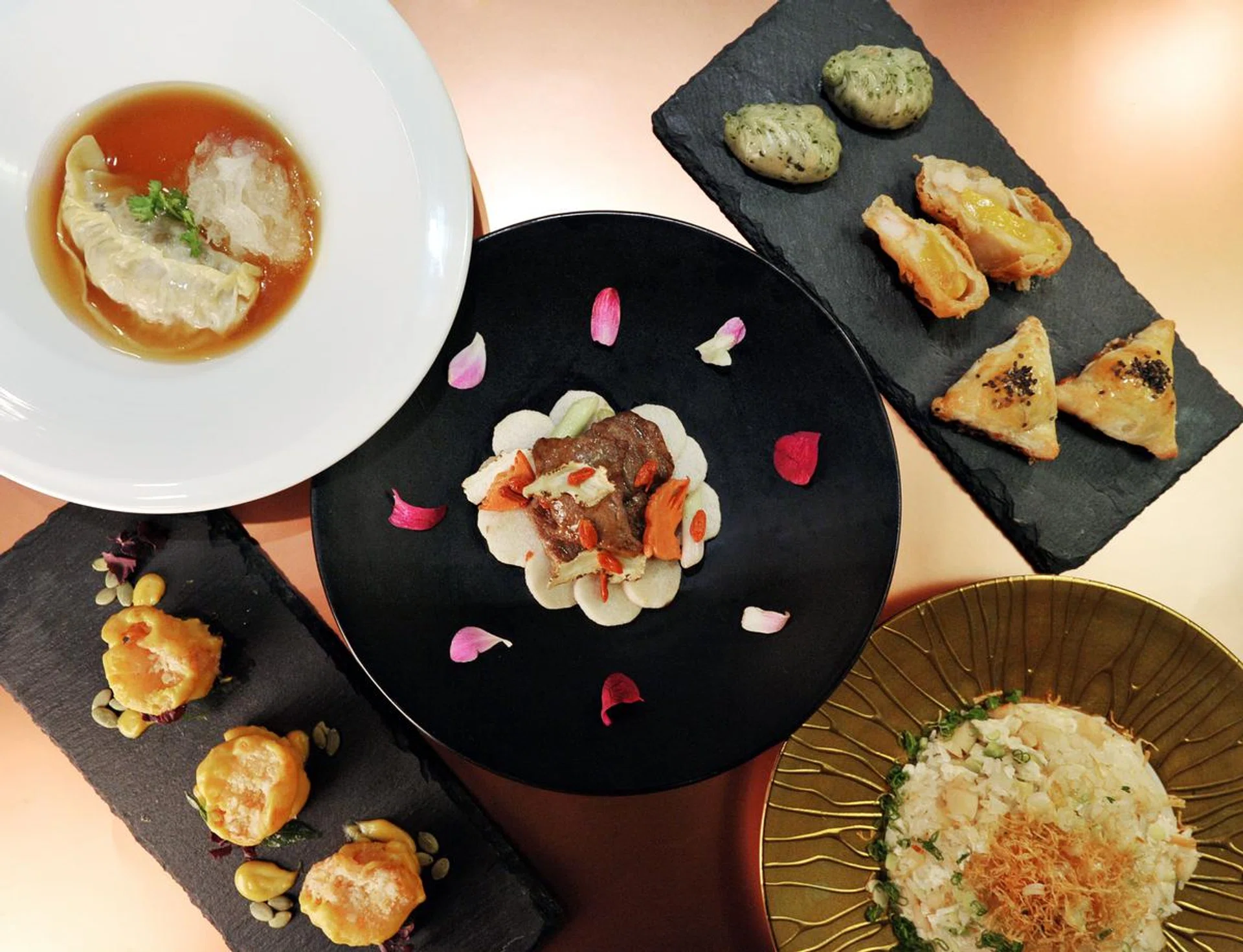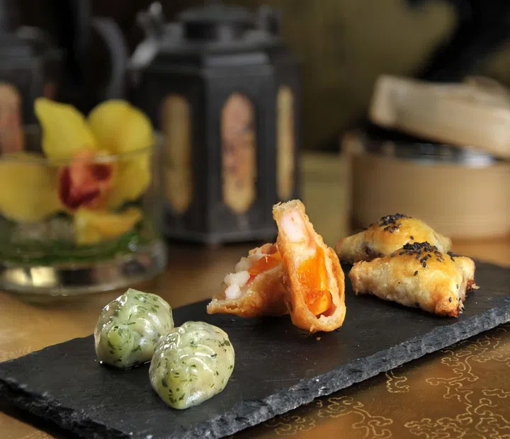 Steamed Vegetarian Dumpling, Deep Fried Mango Roll with Prawn, Baked Pork Puff with Black Pepper Sauce