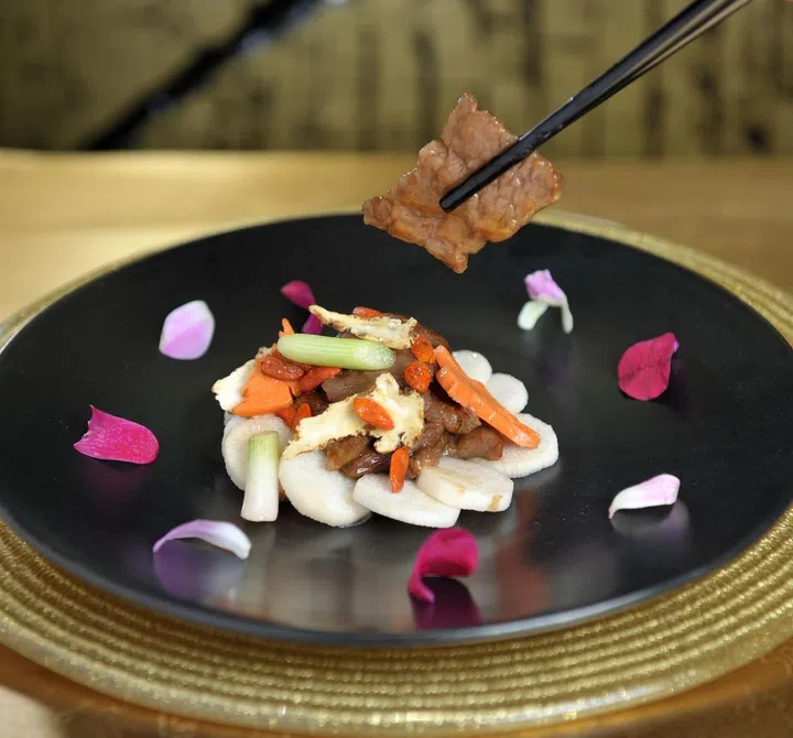 值得推荐的还有当归淮山炒肥牛,花雕酒浸泡当归两个星期,伴着淮山与枸杞子香炒牛肉片,细滑爽口,芳香诱人。