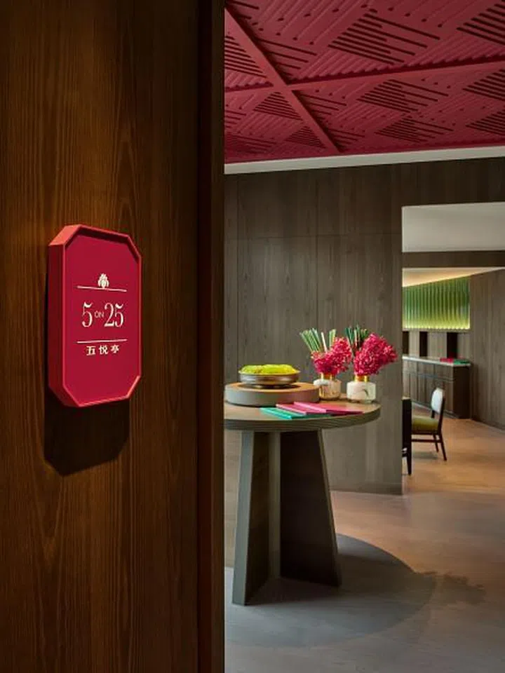 在五悦亭雅致的用餐空间内,设有两间贵宾包厢绿宝石(Emerald)和红宝石(Ruby),让宾客在私密空间放松心情,享受美食,无疑是各种商务宴请或私人餐会的最佳选择。绿宝石包厢以象征和谐丰裕的绿色为主调,可容纳12人;红宝石包厢则是充满活力喜气的红色主调,象征热情与幸福,可容纳八人。