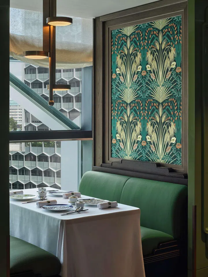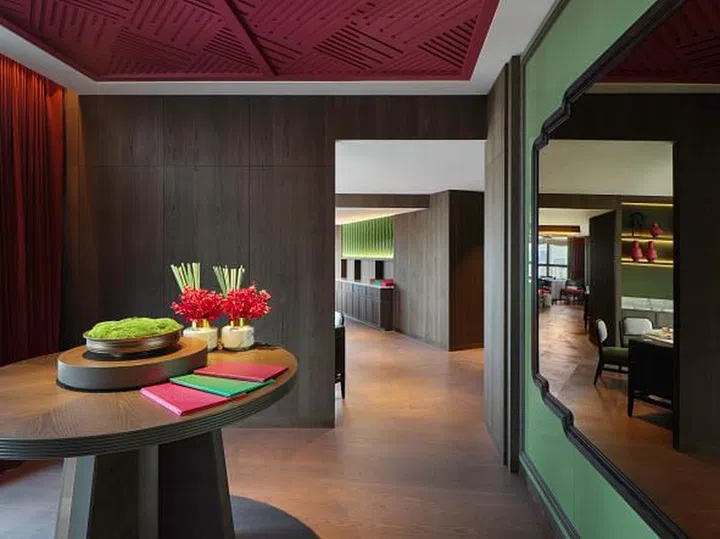 321平方米的餐饮空间,可容纳70位食客,整体内饰装潢考究,处处散发上世纪50年代含蓄典雅的东方美学魅力。由著名的香港建筑设计师傅厚民(André Fu)操刀设计,运用大量浓郁深沉的色彩,如酒红色、黑巧克力色与绿色等,交织出低调奢华的怀旧氛围。