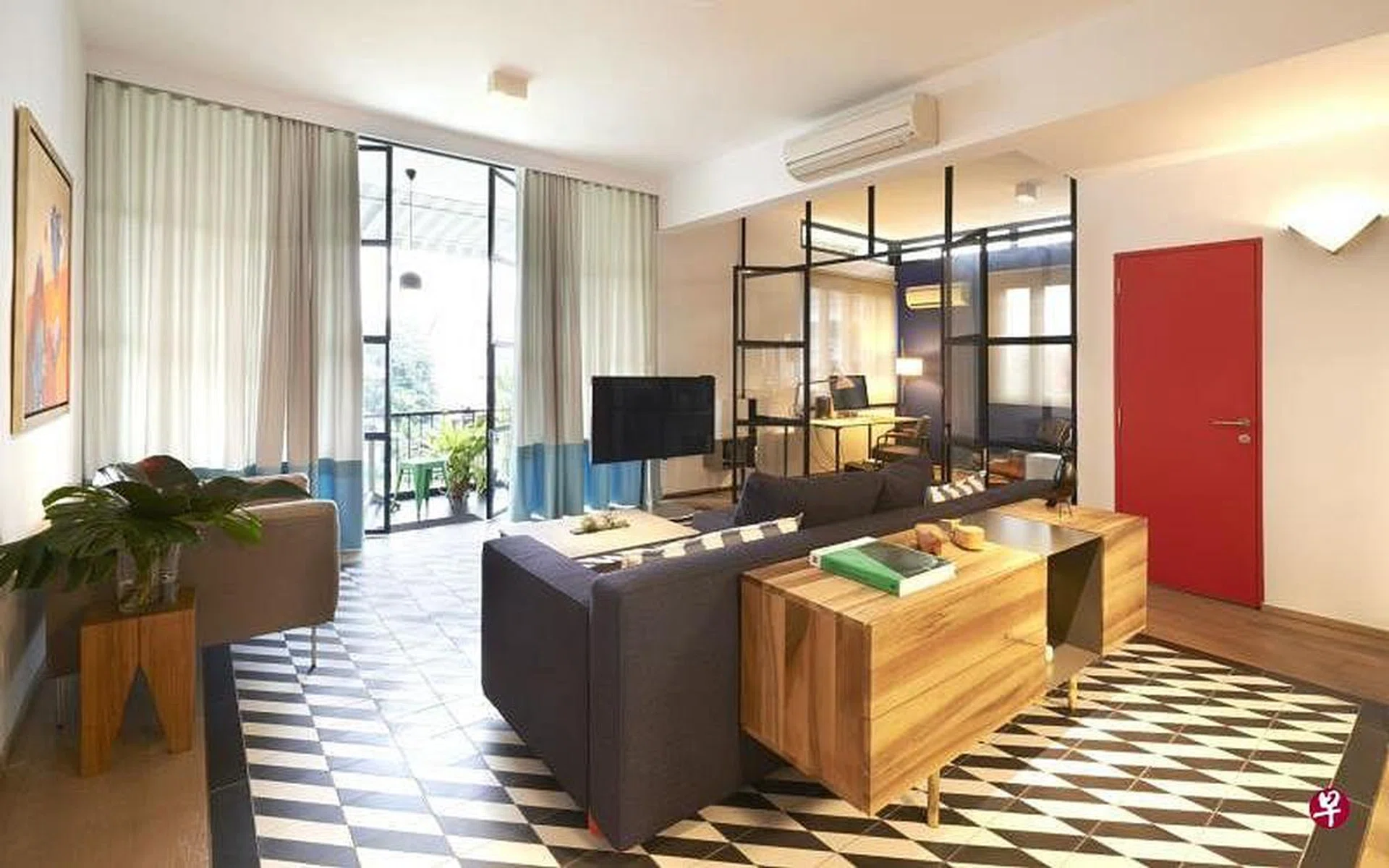陈伟如用不同的地砖将客厅区分开来,她特地选不同的黑色地砖作为地砖的边框,中央的黑白斜格子宛如地毯,框住客厅两张舒服的沙发、杂志架、茶几和咖啡桌。