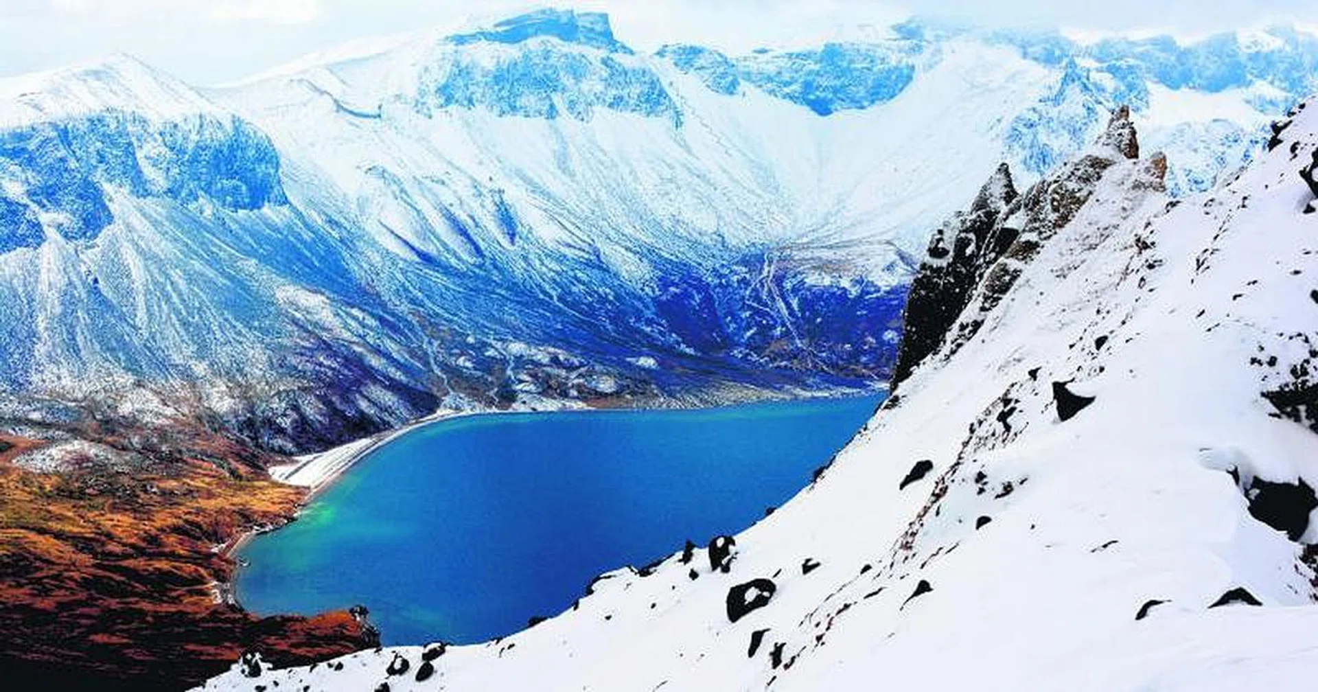 走到山崖边,立即冲向已围堵成圈的人群。我把头插进人缝里,整座天池就在眼前。一览无遗的池水深蓝深蓝,穿过云层的阳光在水上散发着金色涟漪,四周山壁几乎都给白雪铺满。我慢慢沿着山壁走,想从多几个角度窥探天池的奥秘,天却飘下白雪,守卫呼喝着快下山。
