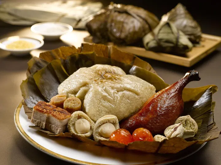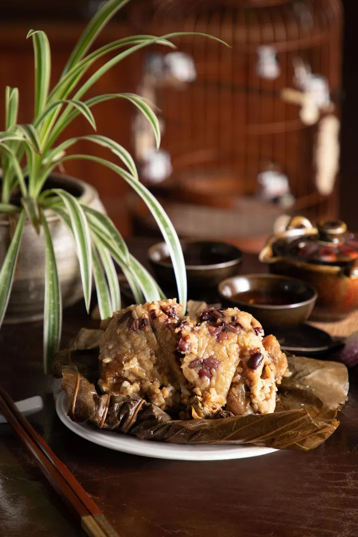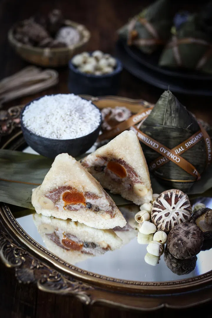 瑞吉酒店(The St. Regis Singapore)的宴庭则选择走奢华路线,全新推出的鲍鱼果蒸粽包含的全部都是最上等的食材——鲍鱼、干贝、鲜虾、鸭肉、猪腩肉、咸蛋黄、板栗、香菇与莲子,蕴含着美好祝愿。