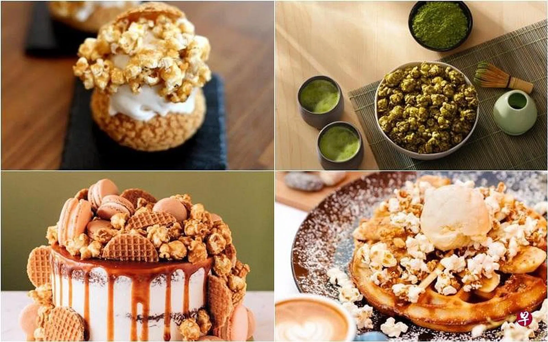 最近,美国著名的Garrett Popcorn推出限季的抹茶酥脆焦糖爆米花口味,卖得火热。爆米花不单是到戏院看戏的必吃零食,它已经“走”出戏院,在本地的咖啡馆与甜品店,以各种姿态与口味出现。从爆米花鸡肉比萨、爆米花格子松饼、爆米花雪糕泡芙、爆米花蛋糕到爆米花拿铁,咸甜冷热皆可。