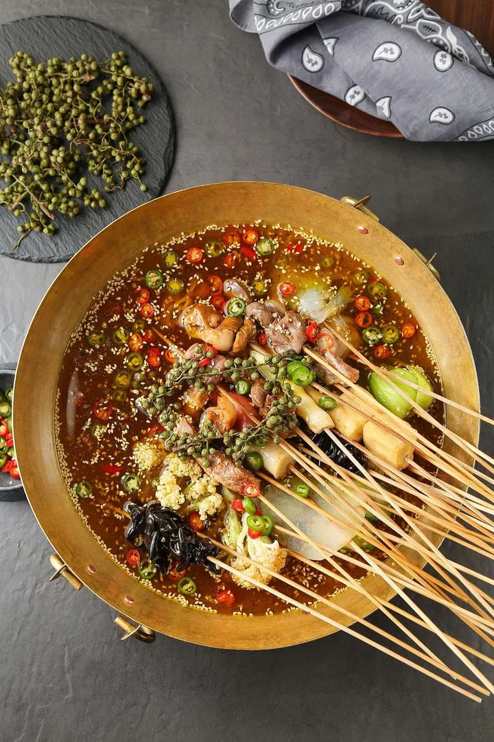 著名品牌在中国有40多间店,新加坡分店位于Orchard Central,主打串串锅。不是一般在桌面上烫煮的火锅形式,肉串或蔬菜串先以高汤煮过,再放入食客自选的辣汤或鸡汤,进一步吸收汤头的味道,热腾腾上桌,有超过20多种选项,包括麻辣牛肉、鸡胗、腐皮、马铃薯片等等。