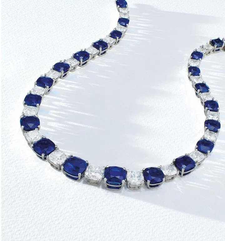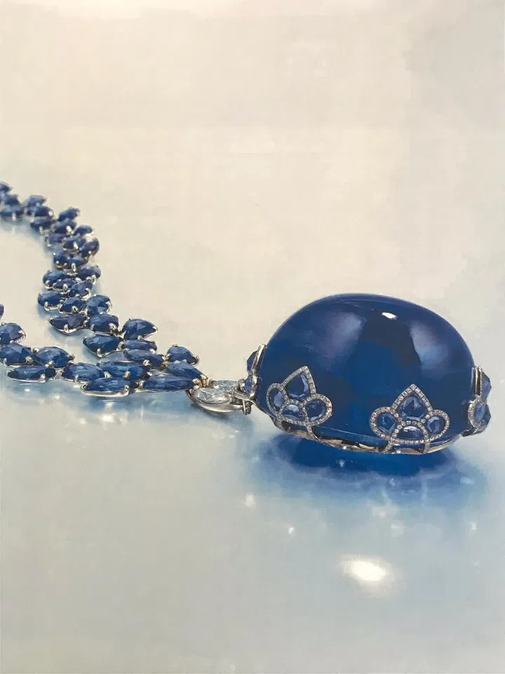 这条重达109.08克拉的项链镶嵌了21颗和谐并列的蓝宝石,其中最大的主石重达10.56克拉。每颗蓝宝石均产自以开采世界珍稀蓝宝石闻名的克什米尔矿场,色泽浓郁纯澈,展现独特深邃的矢车菊蓝色,就像孔雀颈项上的蓝色,因而得名。估价为9500万1.2亿港元,并有望刷新克什米尔蓝宝石项链世界拍卖纪录。