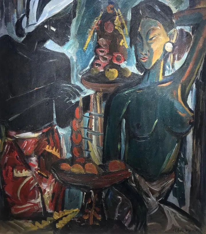 50年代,几位新加坡先驱画家效法欧洲印象派大师到大溪地写生的情怀,他们则去了峇厘岛采风,以当地的民俗风情入画,其中一位就是陈文希。陈文希1906年生于广东揭阳,1948年南来新加坡,在1991年去世。近年来随着国际画坛与收藏界对狮城南洋画派的日益重视,陈文希著名的猿猴彩墨画系列也在拍卖会上受到注意。这次佳士得香港秋拍会拍卖一幅陈文希较少见的峇厘主题油画,描绘峇厘女子祭祀神明的情景,画风与后期大不相同。这幅画估价介于100万至160万港元。