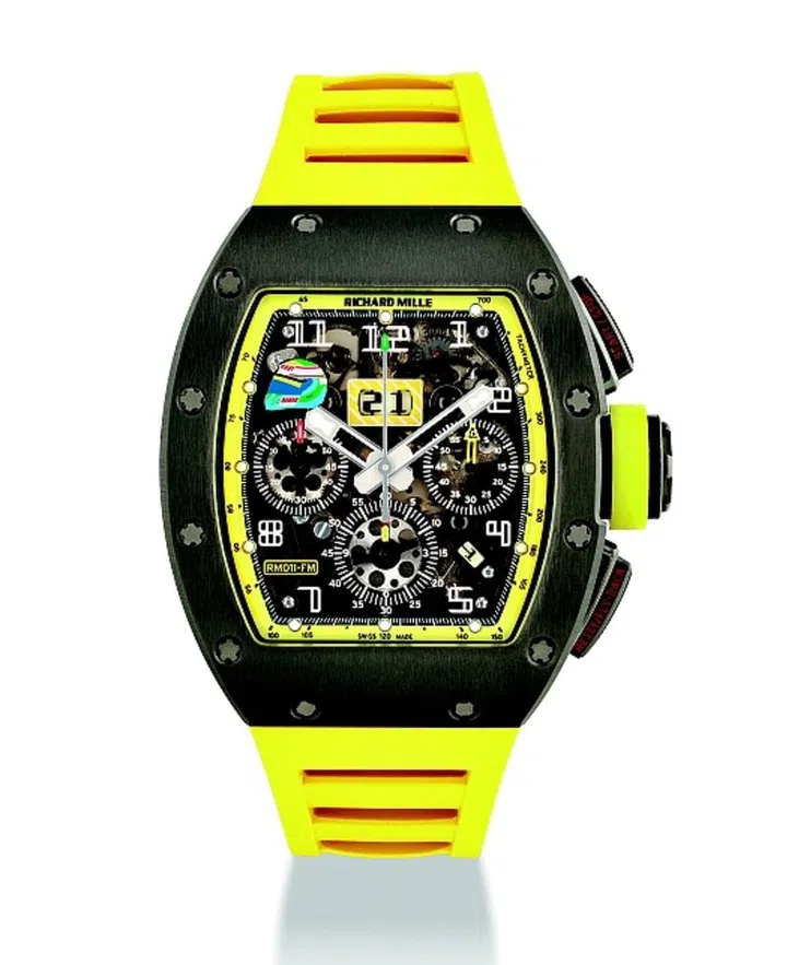Richard Mille的RM011 Felipe Massa型号限量腕表,编号00的腕表通常是不卖的,只供代言人佩戴或作为展示用途,但有一位亚洲私人收藏家竟然有办法收藏了11款编号均为00的RM011 Felipe Massa腕表,这回难得一次过释出心头好,在佳士得香港2018秋季拍卖会上让腕表爱好者竞投。这个型号的腕表,款款设计独特,从材质到设计细节都各具特色,竞投者可一次过买下11款,也可以只竞投其中一款货数款,估价介于135万至230港元。上图这款RM011 Felipe Massa Grand Prix Brazil钛金属自动上弦镂空腕表,是这次拍卖的11只编号均为00的相同型号腕表之一,配有计时功能和年历显示,制作于2014年,编号00/10,估价为165万至230万港元。