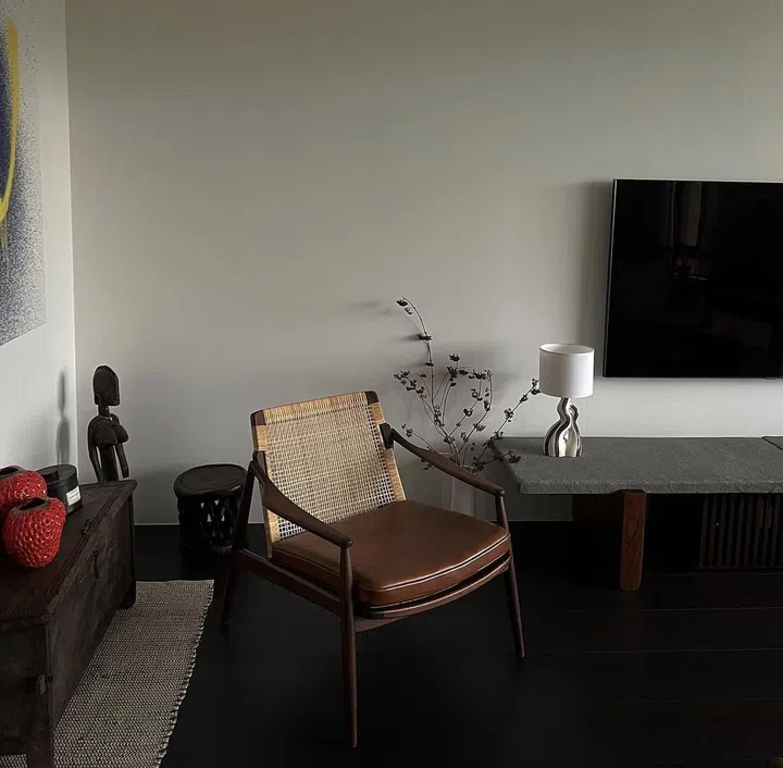 从杨祐宁的家具选择中,可看出他偏爱复古风的经典设计。客厅摆放的一张中古椅,是由德国百年品牌Wilkhahn出品的明星之作,结合藤编椅背和皮革座垫,为空间带来雅致沉静的氛围。