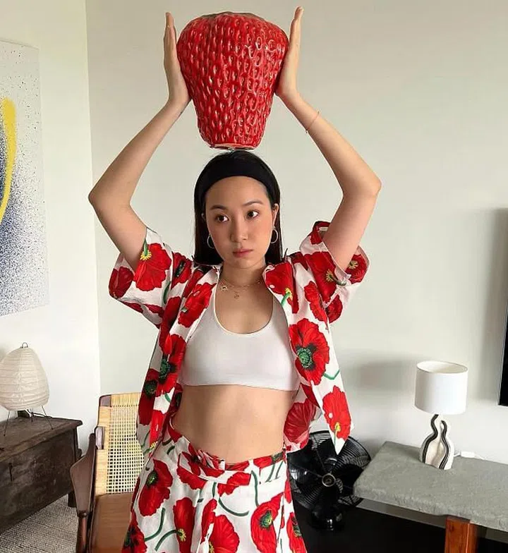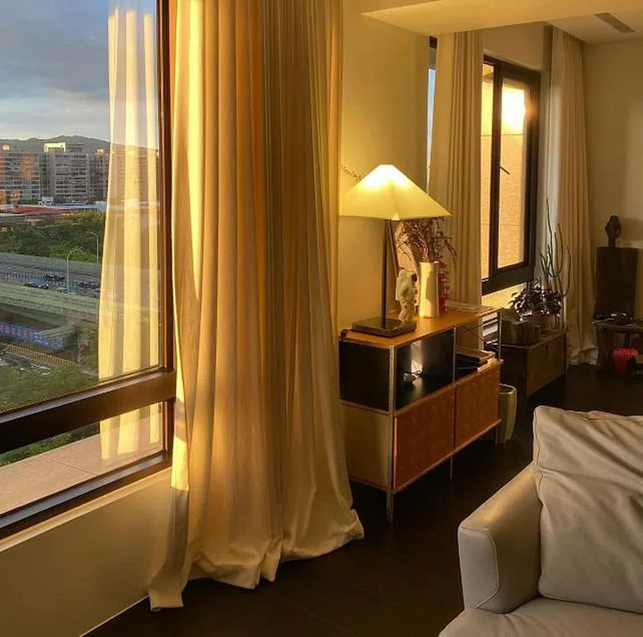 杨祐宁在IG分享家中日落黄昏的风景,留言:“Magic Hour”。梦幻的夕阳光晕填满空间,奶黄色窗帘和家具仿佛洒上一层金粉,和谐地融为一体。窗边摆放着Herman Miller的经典储物柜,台面上则摆放Armani的LOGO lamp台灯,以及意大利品牌SELETTI的宇航员花瓶摆件,处处都是小心思。