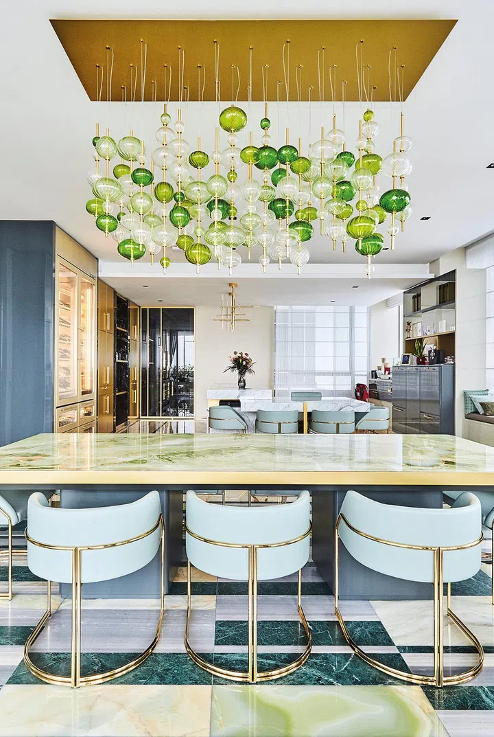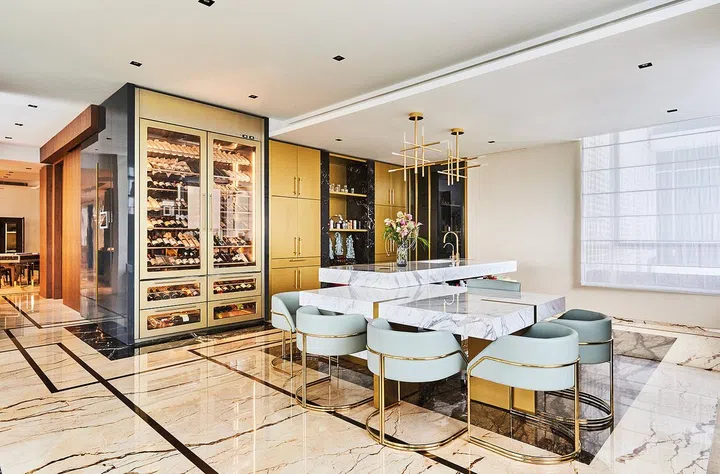 敏感,当初才会舍弃优质洋房,以可媲美优质洋房的价格购入目前的单位。房子室内设计由意大利顶级家居名品设计公司Saporiti Italia一手包办,墙面、地面、橱柜甚至大型餐桌等均大量运用意大利各色云石,拼砌出不同的几何图形,让空间呈现高贵感的同时更显活泼灵活,大大减低云石的冷冽感。