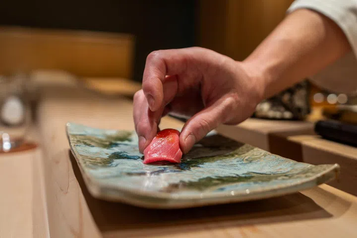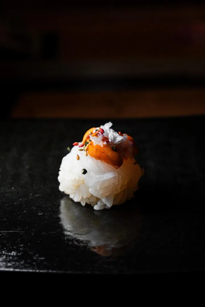 菜单随季节和渔获变化,鱼由日本每日直送,经盐渍、清洗、腌制等古法工序,以不同温度与盐度调整至最佳状态,使鲜味得以层层沉淀。同样的精致延续至米饭——寿司的灵魂。主厨严选 Hitomebore与Sasanishiki 两种米,混合红醋与白醋(比例根据季节而变)再以双盖陶锅慢火蒸煮,食让材达到最佳风味,展现极致匠心。