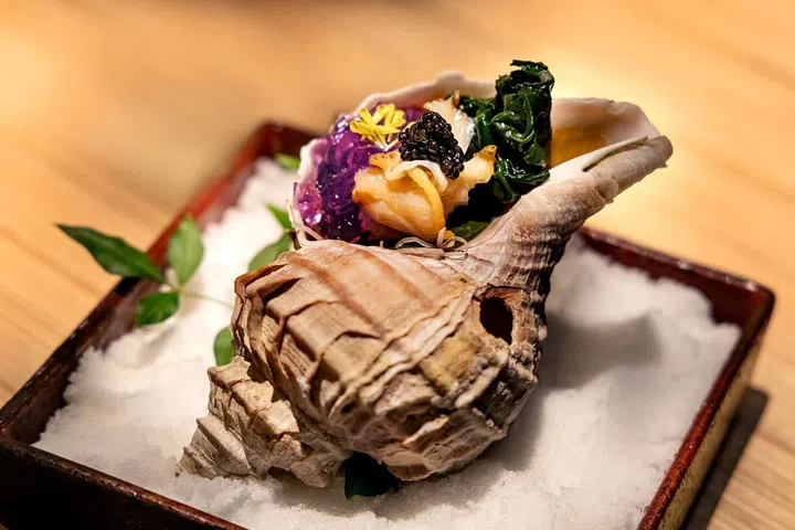 Miyoshi by Fat Cow Omakase厨师做主套餐中的Kinjisou Tsubugai(蛾螺、金时草、俄罗斯鱼子酱、日本菊花)