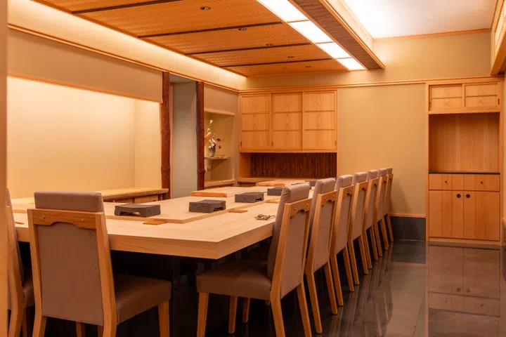 餐馆采用日本数寄屋风格设计,营造宁静私密氛围。以天然榧木、杉木及和纸灯光构建温润空间,完美衬托料理的精致细节。