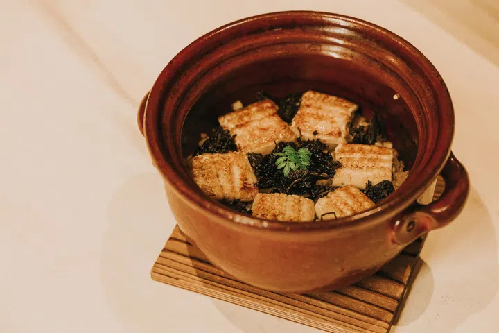 主打现代日本割烹的一期一江(Ichigo Ichie)从罗拔申码头洲际酒店搬迁至乌节路的Claymore Connect,环境更加宽敞舒适。坐在吧台座位不仅可以近距离观赏主厨料理的过程,还可欣赏陶瓷艺术品。来自日本东京的主厨江野茜依旧以当季时令食材为主角,推出厨师做主omakase套餐。新菜单中有不少菜肴以茶为主题,将不同茶类加入菜肴制作中,例如前菜小点莲藕牛蒡搭配的是洛神花茶果冻,清爽开胃。金枪鱼刺身加入正山小种(lapsang souchong)调味的酱油腌制。正山小种是中国生产的一种红茶,被称为红茶鼻祖,茶叶经松木熏制而成,有着非常浓烈的松烟香。日式鳗鱼砂锅饭以冻顶乌龙茶烹制,带有淡淡的甘甜香味。甜点是玄米茶口味雪糕,搭配芒果及酱油果冻。