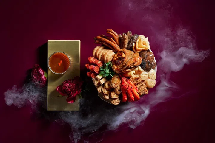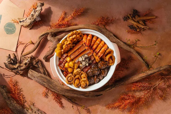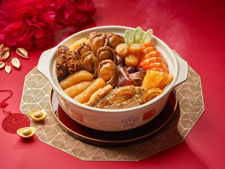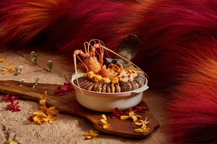 饭夫人(Madame Fan)“鸿运聚宝盆”(Prosperity Poon Choi)采用鲍鱼、海参、扇贝、虎虾等优质食材,最大亮点还有厚实的猪肘。盆菜以自制鲍鱼上汤搭配山药,用慢火熬制4小时,味道丰富浓郁。