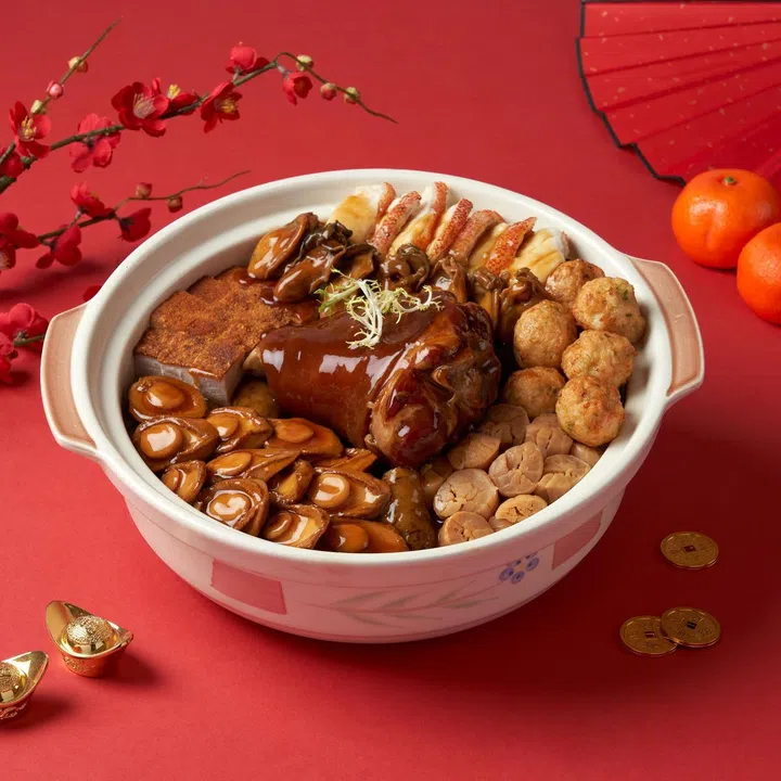 良木园酒店(Goodwood Park Hotel)属下中餐馆岷江川菜馆(Min Jiang)和岷江在登布西山(Min Jiang at Dempsey)今年各自推出“幸福元蹄福袋海味锅”(Braised Boneless Pork Knuckle,Beancurd ‘Fortune Bags’ stuffed with Chicken & Water Chestnut, and Sea Treasures in Pot)和“金鲍元宝凤凰海味煲”(Braised Pork Belly, Baked Chicken Thigh,Beancurd Pockets stuffed with Shrimp Mousse& Dried Scallops, and Sea Treasures in Pot),前者以富含胶原蛋白的猪蹄为主角,搭配鲍鱼、海参、干贝、豆腐皮、发菜、香菇、萝卜以及装满鸡肉末和马蹄的“福袋”,美味又养滋补。后者则以鸡腿为主角,经过特制调味酱汁腌制,然后烤至酥嫩,其他材料包括豆腐袋、红烧五花肉片、一系列干海味和天津白菜。