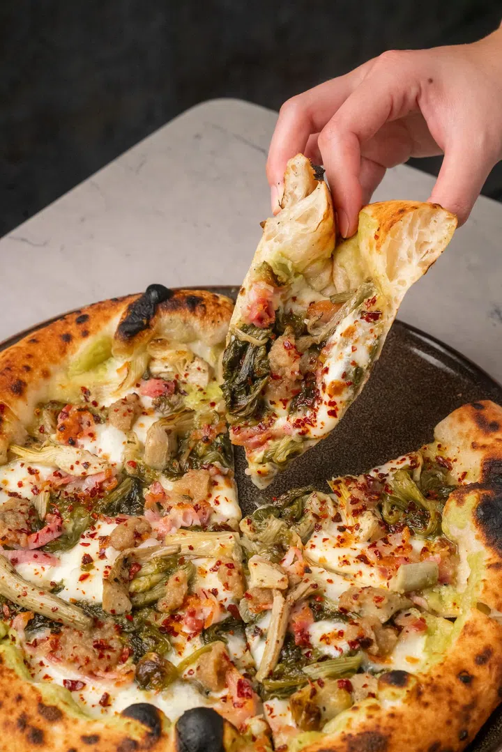 在新加坡分店,食客可以期待多款招牌比萨,如内含乳清干酪酿边和手工肉丸的 Abbraccio e Mamma、以 Fior di Latte 芝士为底,搭配意大利莫塔德拉火腿、开心果与罗马佩克里诺干酪的Tetti Illuminati;以及主打碎番茄、肉丸和罗勒的Napolitudine。此外,还有以熟火腿、蘑菇和洋蓟为主角的 Come Una Capricciosa。