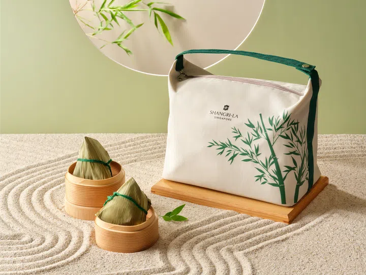 新加坡香格里拉(Shangri-La Singapore)的“香宫端午节礼盒”(Shang Palace Rice Dumpling Gift Set)汇聚匠心工艺与非凡美味,将传统食谱与奢华食材完美融合,里头除了招牌香宫金华火腿瑶柱粽(Shang Palace Signature Barbecued Pork Rice Dumpling with Yunnan Ham and Conpoy)、 风味娘惹粽(Traditional Nyonya Rice Dumpling)、松露咸蛋肉粽(Truffle Pork Belly with Salted Egg Yolk Rice Dumpling)以及香宫金牌虾米酱(Shang Palace Dried Shrimp Sauce),还有今年全新推出的创新口味紫米咖椰流心粽(Sweetened Purple Rice Dumpling with Homemade Kaya)。黑糯米包裹着绵软的麻糬,中心则是咖椰酱,切开后像“熔岩”一样呈献爆浆流心效果。精美粽子包装从大自然汲取灵感,呈现竹林的静谧之美与现代中式风格,同时致敬传统粽叶包裹技艺。包装设计实用又环保,可当作保温袋或便当袋重复使用。