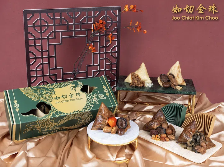 本地老字号如切金珠(Joo Chiat Kim Choo)推出的几款粽子礼盒包装精美,尤其是皇家珍宝礼盒,站立式的礼盒从两侧打开像把扇,六个至尊皇粽皇放在两排并列小格子内,盒子也可用来装首饰或糖果,用来送礼最适合不过。品牌推出七款咸粽:客家梅菜扣肉粽、黄金咸蛋福建鲜肉粽、广东豆粽、至尊皇粽皇、黑金糯米娘惹粽、娘惹粽和潮州豆沙粽。至尊皇粽皇包裹干贝和腊肠等优质材料。