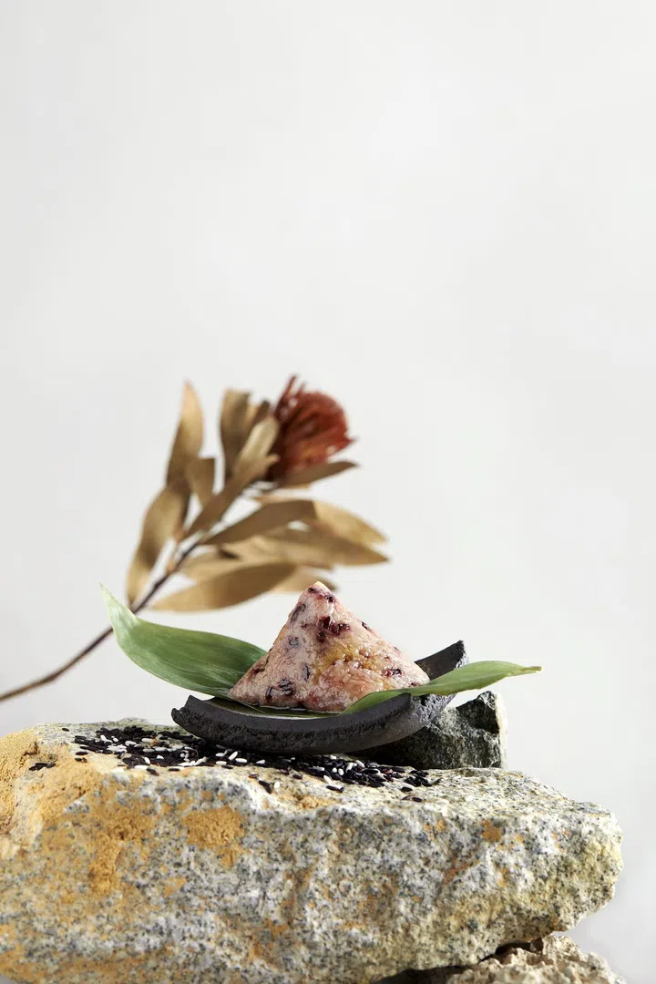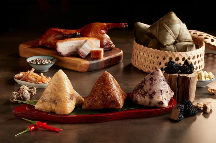 气派奢华的萍果木松茸鲍鱼鹅肝烟熏鸡肉粽(Applewood-smoked Rice Dumpling with Abalone, Matsutake Mushroom, Foie Gras and Smoked Chicken),限量发售100颗,香宫(Shang Palace)主厨莫杰强师傅以四头鲍、鹅肝、干贝、松茸、烟熏鸡肉、咸蛋黄、有机藜麦、栗子和绿豆制成的将法式料理常见的食材与传统肉粽巧妙结合,再配上一点特制四川辣椒酱取得画龙点睛的效果。另一款今年全新推出的口味则是黑松露香栗南瓜素鸡棕( Black Truffle, Chestnut Pumpkin and Vegan Chicken Glutinous Rice Dumpling),这款全素粽用荷叶包裹素鸡、栗子、南瓜、蘑菇、莲子、黑眼豆、枸杞、绿豆等食材,搭配香气浓郁的黑松露片和黑松露酱。此外,香宫也推出限量100组的“亚洲风味经典礼盒 ”(Heritage of Asia Rice Dumpling Gift Set),内含云南菌菇粽、传统福建粽、泰式打抛猪肉粽、XO鹅肝火腿鸡肉粽、紫米奶皇流心粽和白莲蓉松露枧水粽。香宫端午节礼(Shang Palace Rice Dumpling Gift Set)则有5颗粽子,包括传统风味娘惹粽、创新紫米奶皇流心粽、黑松露香栗南瓜素鸡粽,以及100g茶叶。