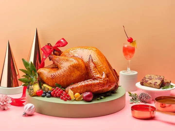万豪董厦酒店(Singapore Marriott Tang Plaza Hotel)今年新推出的烤火鸡口味,灵感来自本地著名的鸡尾酒‘新加坡司令’(Singapore Sling)。为了达到外脆内软多汁的效果,必须先将火鸡浸泡在一种由橙子、杜松子、肉桂、红糖、白葡萄酒以及樱桃酒等成分组成的腌制液中,长达72小时,确保完全渗入到火鸡肉里。搭配清爽的樱桃和黄梨填馅,与味道浓郁的火鸡肉相得益彰。