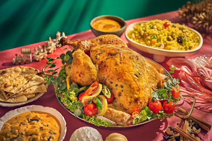 良木园(Goodwood Park Hotel)每年圣诞都会带来惊喜,今年特别推出北印度风格烤火鸡,为经典圣诞菜肴增添有趣的亚洲风味。火鸡采用混合香料调味,如生姜、大蒜酱、豆蔻粉和青椒等,经过两天的腌制,最后加上切达奶酪和新鲜奶油然后烤熟。火鸡肉质滑嫩,搭配马哈尼酱(Makhani Sauce)、蔬菜库尔玛(Vegetable Korma)、克什米尔香饭(Kashmiri Rice)和印度烤饼一起吃,再适合不过。
