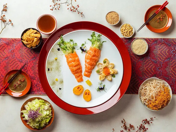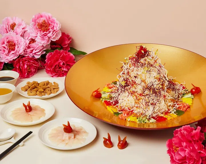 位于国家美术馆(National Gallery Singapore)的宴(Yan)今年依旧主打顺德鱼生,仅供堂食的“顺德金箔鱼生捞起”(Kaleidoscope of Prosperity Yu Sheng in ‘Shun De’ Style with Yellowtail Slices),用黄尾鱼刺身取代常见的三文鱼刺身,再加上金箔、炸粉丝、油条、炸紫薯条、炸番薯条、炸芥蓝丝、腌姜丝、花生碎、芝麻等,还有特别精心雕刻成玉兔形状的樱桃蕃茄。此外当然少不了此款鱼生最大的特色:以酸杆汁、柠檬叶片、花生油和酱青调制而成的咸味酱汁。