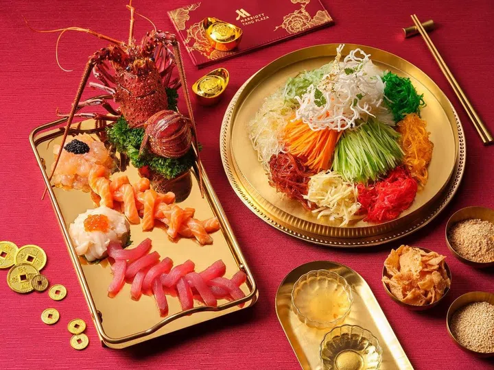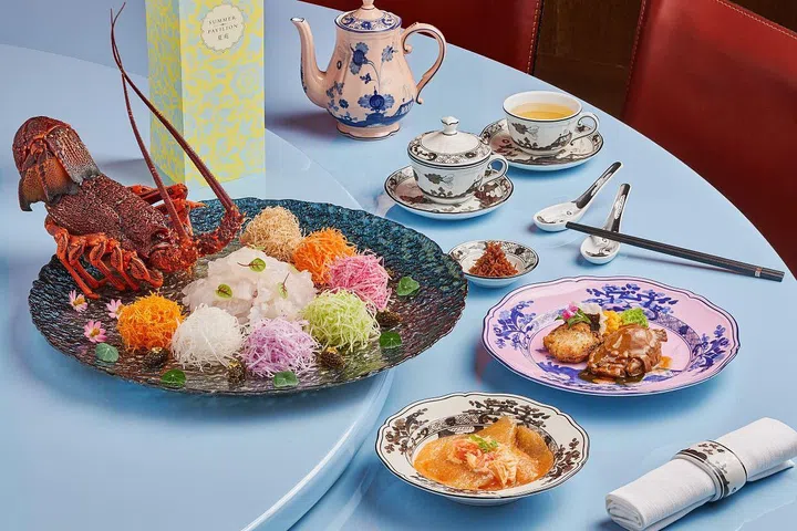 新加坡美年丽思卡尔顿酒店(The Ritz-Carlton, Millenia Singapore)米其林一星中餐馆夏苑(Summer Pavilion)提供多种鱼生选择,其中一大亮点是以澳大利亚龙虾和鱼子酱为主角的Australian lobster and black caviar yu sheng,搭配各类蔬菜、柚子、酸柑和自制酸梅酱,奢华又气派。