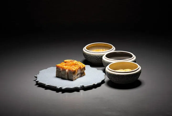 烧肉也提升了档次,外皮酥脆芳香,肉质饱满多汁,搭配中式与欧洲酱汁,包括:芥末、苹果酱、海鲜酱,咸甜交织,令人胃口大开。