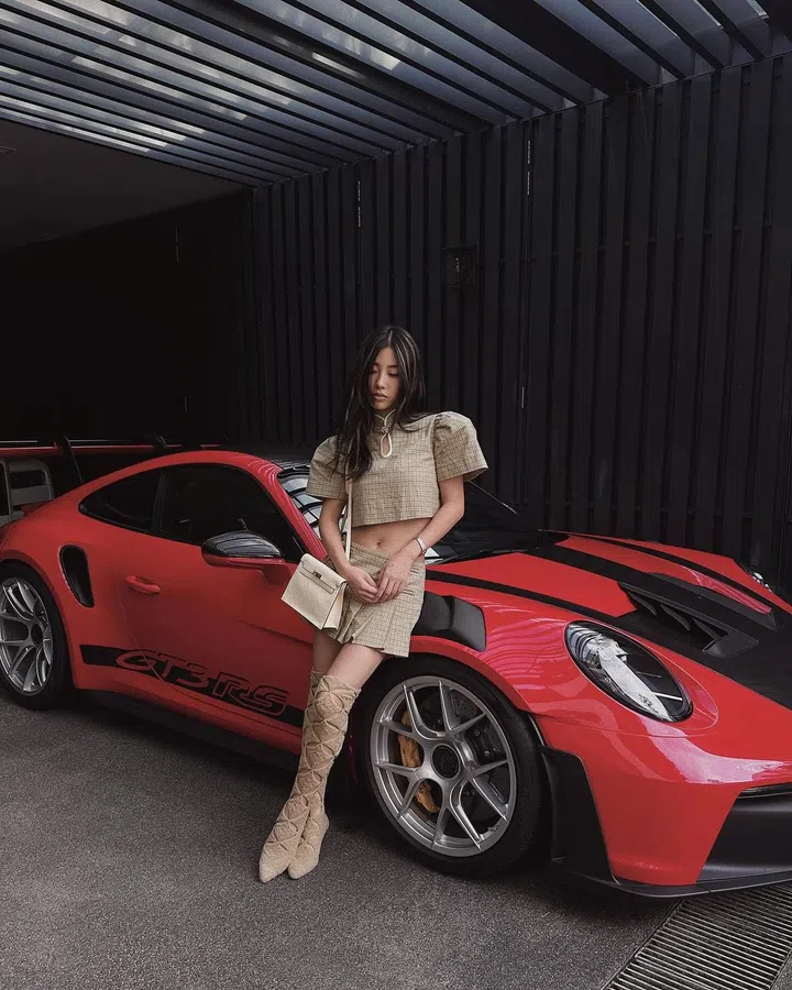 本地博主Mae Tan以独具一格的风格,成为新加坡时尚圈的宠儿之一。她在2019年Netflix真人秀《Singapore Social》上亮相,让观众一窥新加坡年轻人的生活。她的父亲Dave Tan,是将瑞士奢华钟表品牌Richard Mille带进新加坡的幕后推手,也是Richard Mille Asia的首席执行官。她身后的这辆跑车为全新保时捷911 GT3 RS,充分利用了源于赛车运动的技术和概念,其最突出的特点是天鹅颈支撑的尾翼,非常形目且时髦。