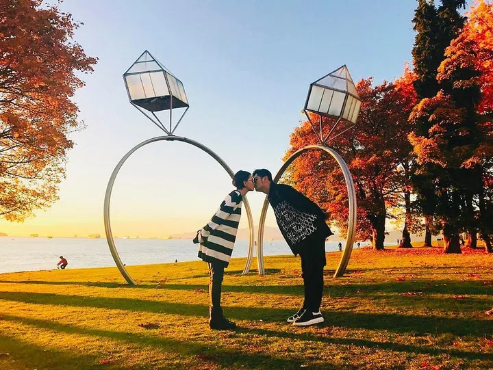 天王周杰伦在情人节晒出了一张和老婆昆凌接吻的合影,两人身着黑白色系衣装,在洒满金色阳光的湖面、草坪和大树旁留影,色调温馨,身后的两盏路灯设计得很有创意,组合起来像是两个婚戒,超sweet!