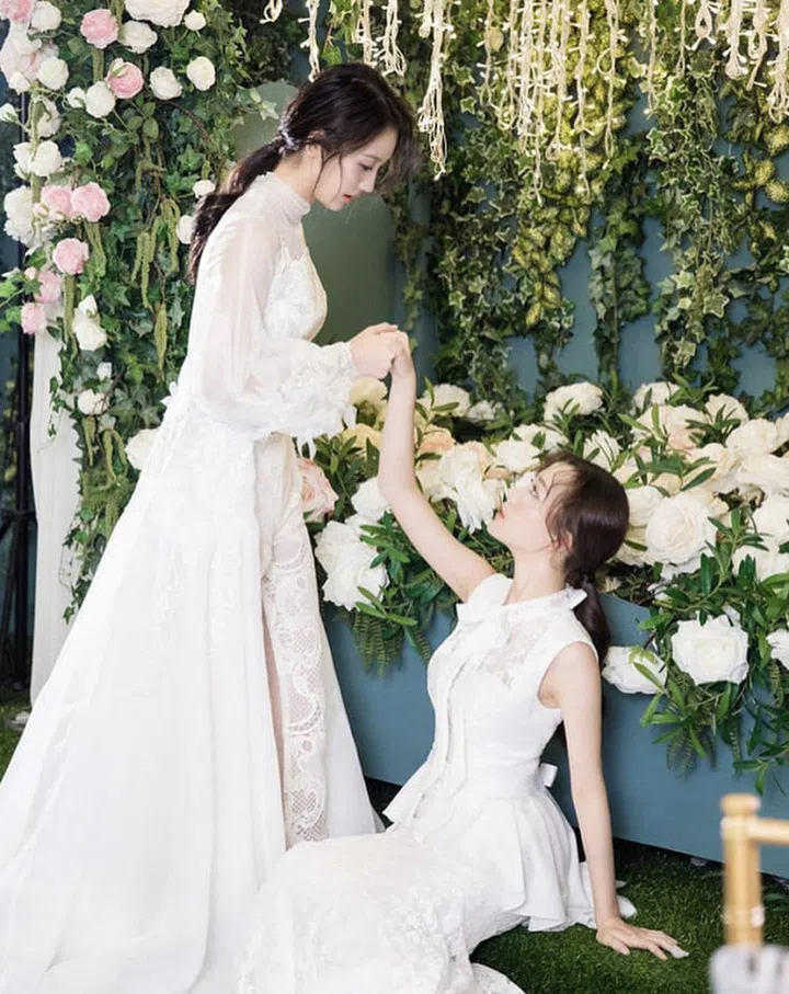 婚礼也能用来纪念闺蜜情谊!SHN48后辈姐妹团GNZ48的两位实力成员刘力菲及谢蕾蕾,在成团时就获得前两名的高分,后来更站上了总决选专属MV《秘密花园》C位,还分别在影视方面都有突破性的表现,相仿的经历使得关系更亲密。虽然均穿着白纱,但分明一个高冷一个温柔,从互动、表情与举止上,就能引发众人想象两姐妹平时如何交流。自行脑补出“强势闺蜜守护软萌少女”的情节,纵使没有“新郎”,画面也格外甜蜜。