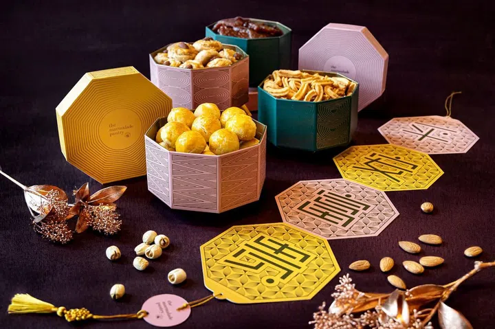 推出红龟粿蛋糕,听起来是不是很有趣?The Marmalade Pantry新推出的这款农历新年限定糕点,其实是香草海绵蛋糕搭配桂花慕斯和绿豆奶油,里面还藏着麻糬,口感与红龟粿很像。另外也有经典的杏仁曲奇、传统鸡肉干、黄梨挞等,以全新八角形包装搭配烫金的几何形线条设计,更有现代感。